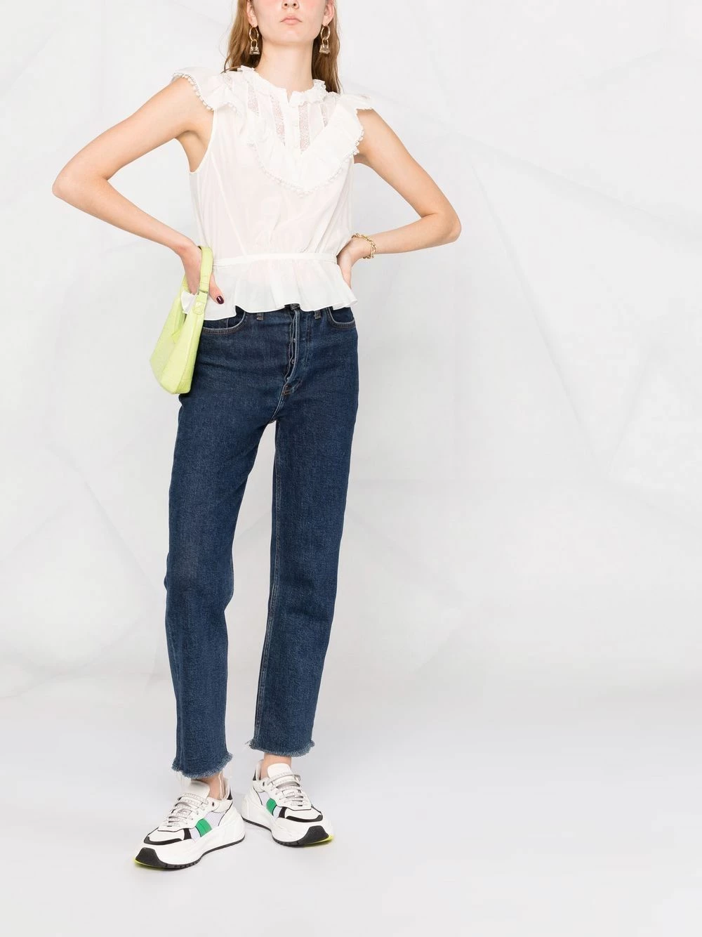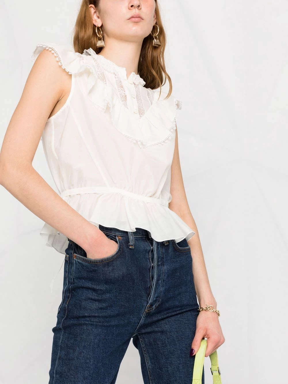 Maille fine, détails de volants, design sans manches, encolure ronde.