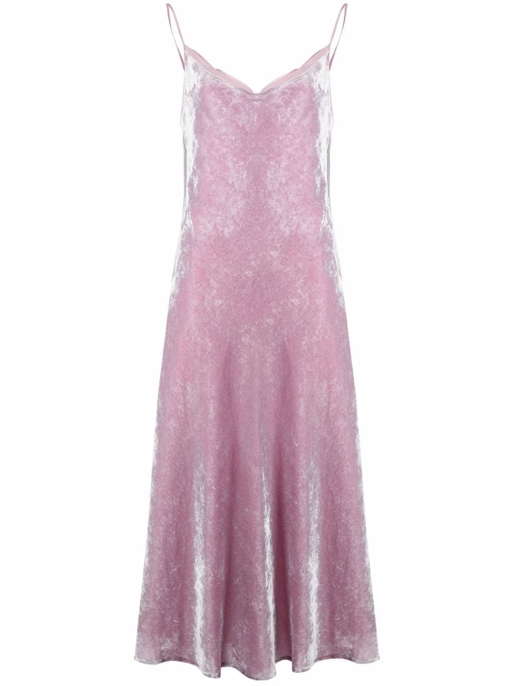 Effet velours, tissu coupé dans le biais, coupe évasée, col v. Matière : soie.