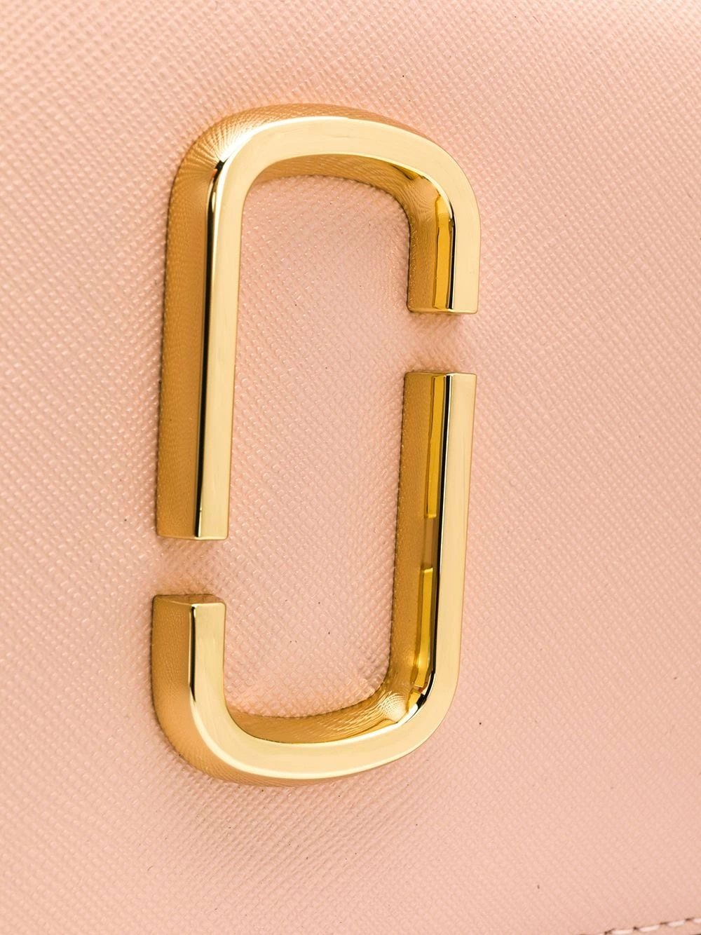 Sac à bandoulière à plaque logo en cuir Marc Jacobs avec un bracelet en maillons, détails plaqués or, rabat à fermeture magnétique et compartiment intérieur. Couleur : rose.