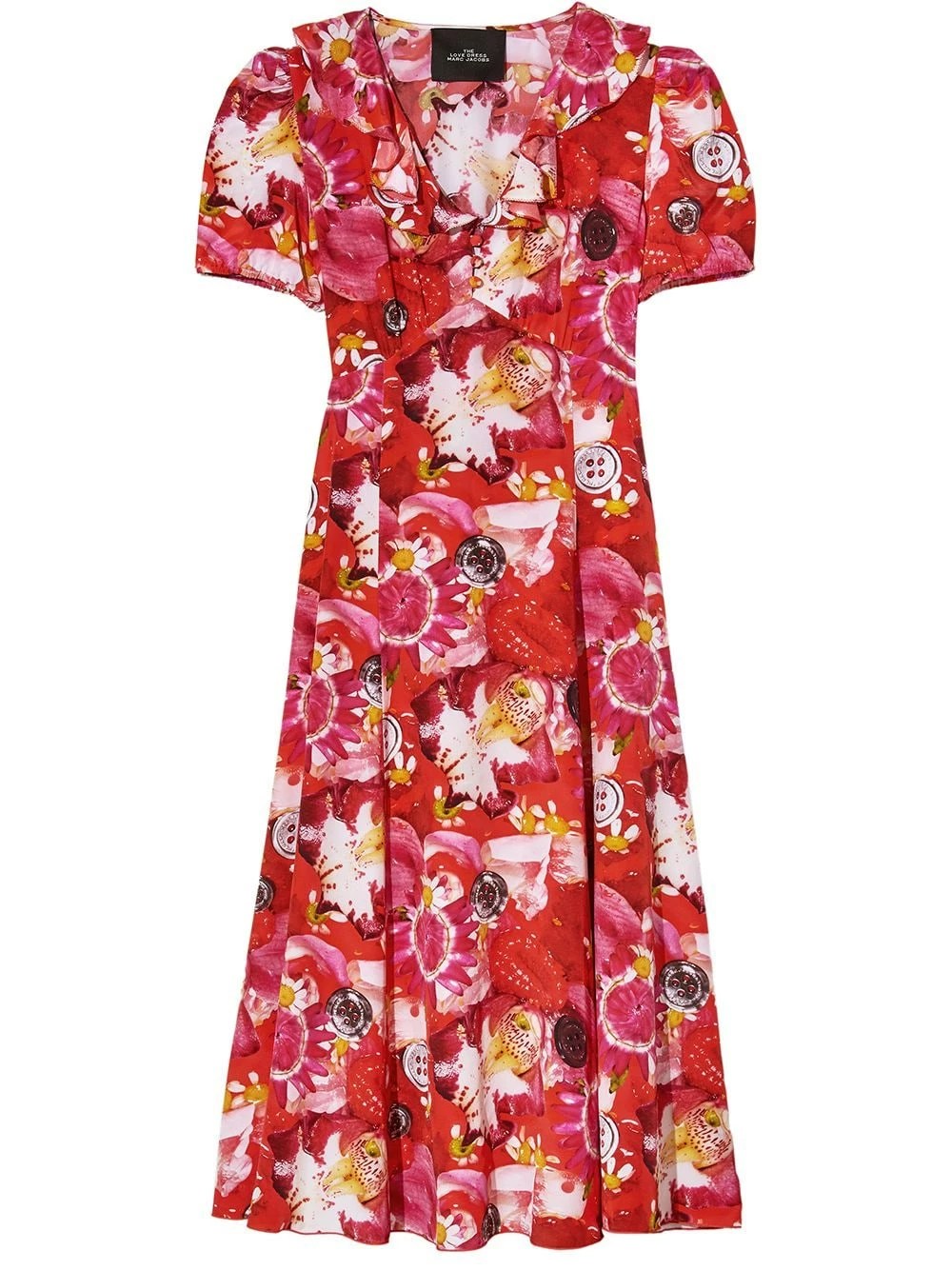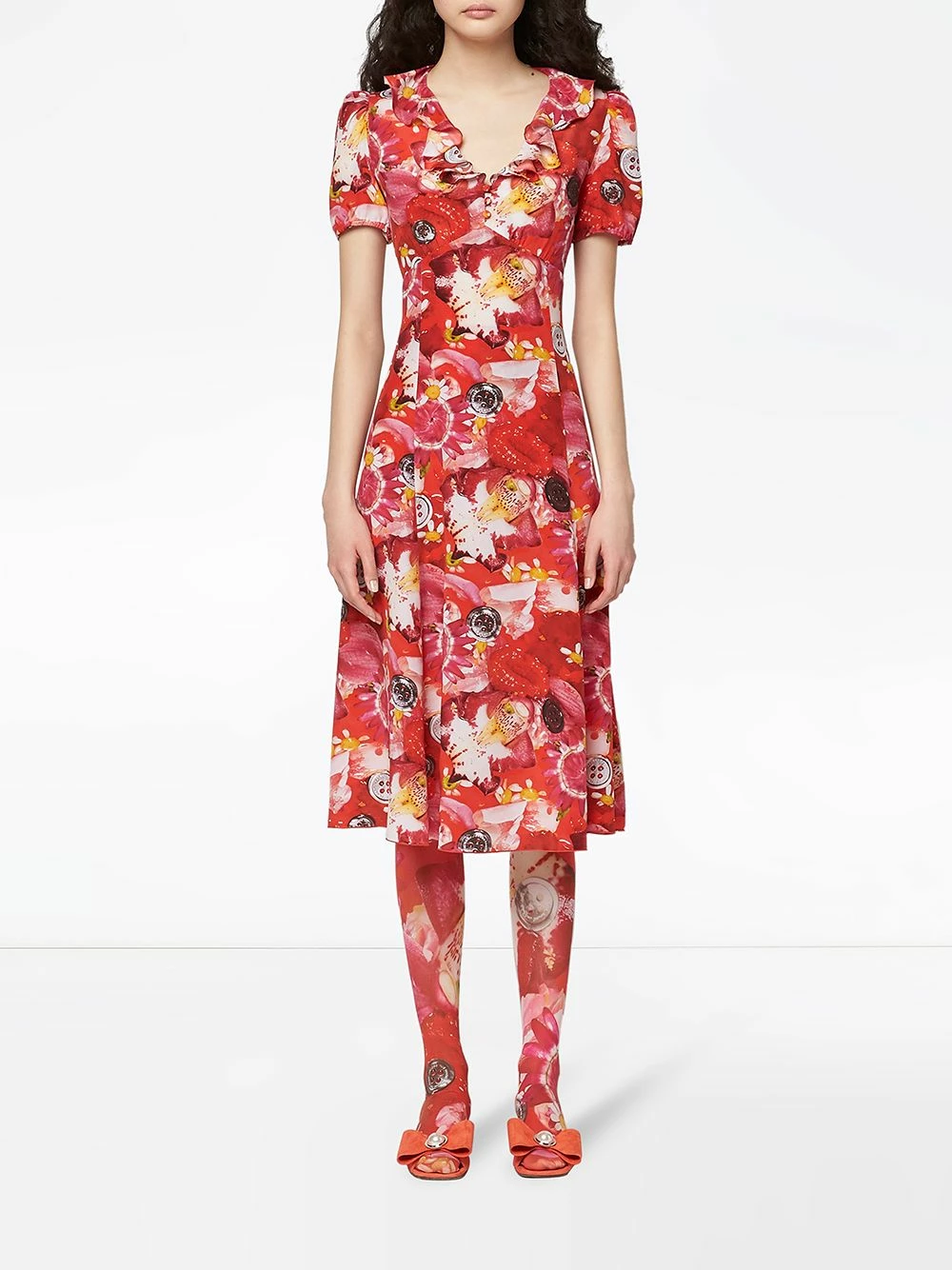 Imprimé à fleurs, col v, détails de volants, manches courtes, fermeture nouée au dos, détails de fronces, longueur genou. Matière : soie.